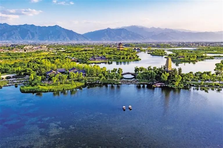 7月7日,航拍夏日的渼陂湖。位于西安市鄠邑區的渼陂湖是秦漢上林苑、唐代游覽勝地,有“關中山水最佳處”的美譽。近年來,重新修復后的渼陂湖恢復了渼陂泛舟、杜堤三橋、空翠野煙等渼陂八景,使周邊地區自然生態環境得到改善。陜西日報記者 袁景智攝